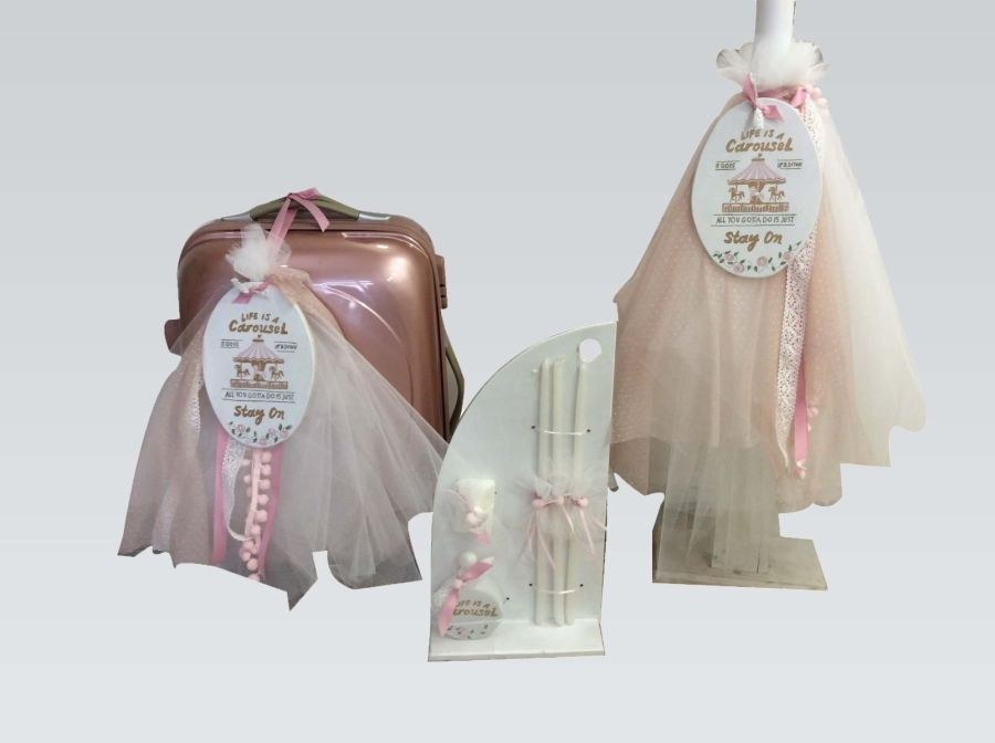 Χειροποίητο σετ βάπτισης που περιλαμβάνει βαλίτσα στολισμένη με θέμα βάπτισης το καρουζέλ, λαμπάδα με ύφασμα και λαδοσέτ.