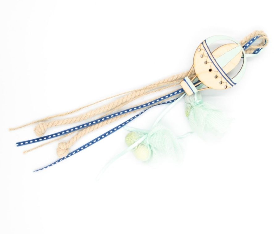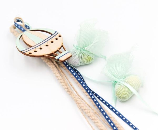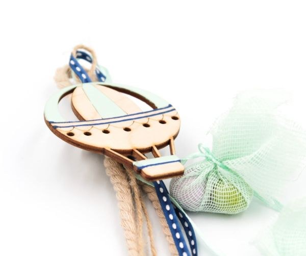 Μπομπονιέρα βάπτισης κρεμαστή με ξύλινο αερόστατο.