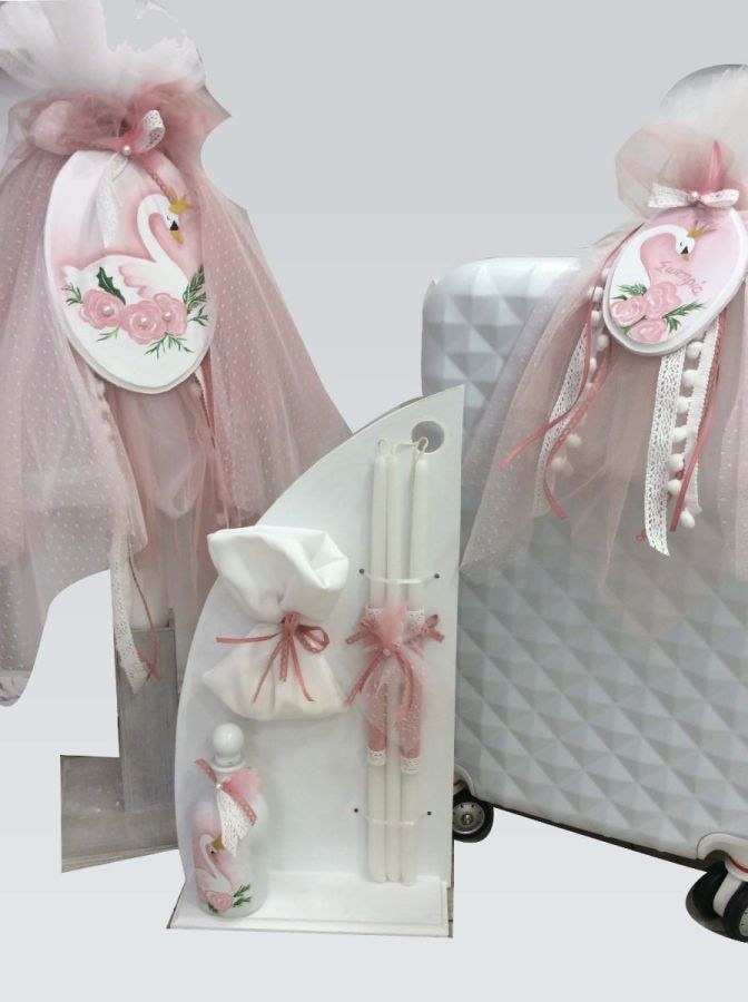 Σετ βάπτισης που περιλαμβάνει βαλίτσα στολισμένη με θέμα την πεταλούδα, λαμπάδα και λαδοσετ.