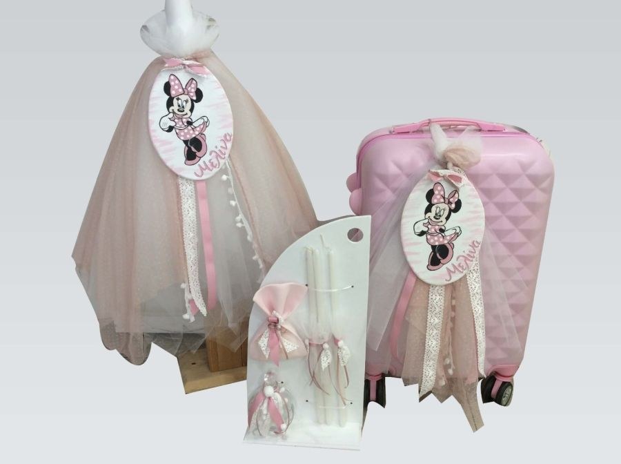 Χειροποίητο σετ βάπτισης που περιλαμβάνει βαλίτσα στολισμένη με θέμα βάπτισης την Μίνι Μάους, λαμπάδα με ύφασμα και λαδοσέτ.