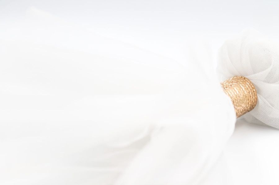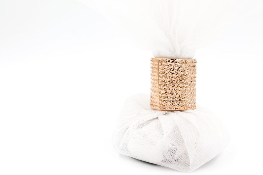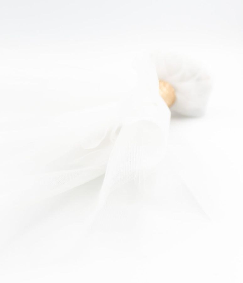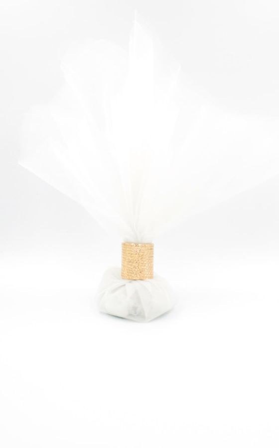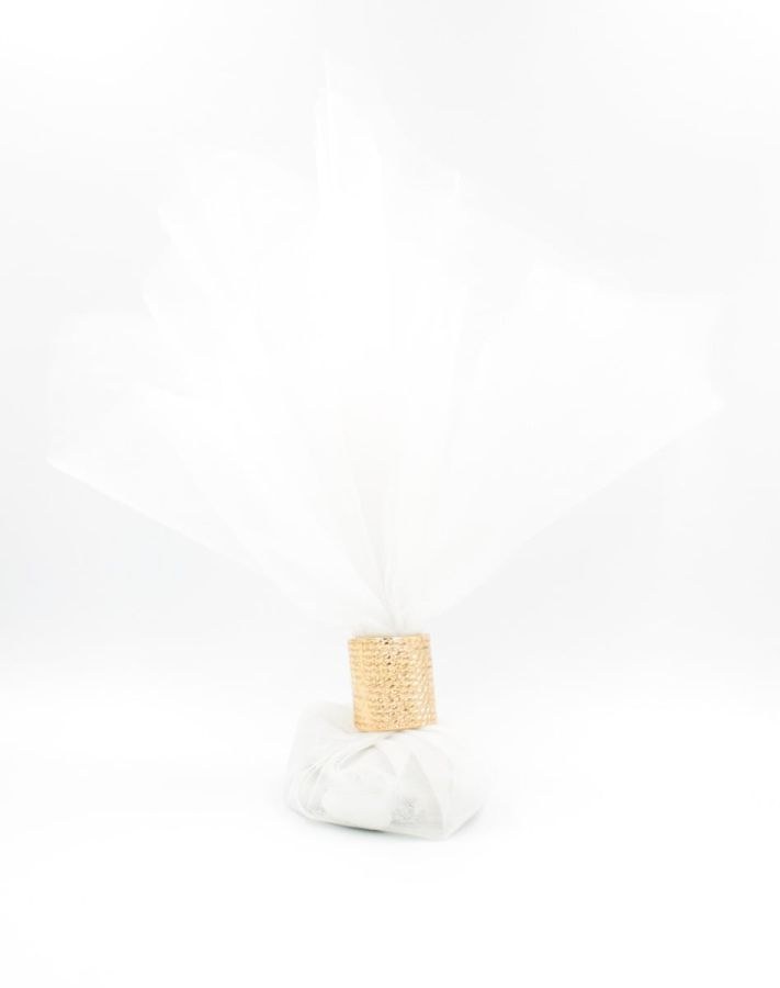 Μπομπονιέρα με 3 τούλια λευκά και χρυσό λαιμοδέτη.