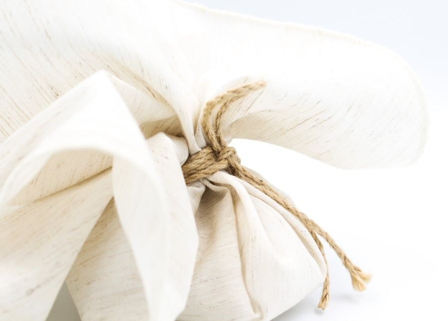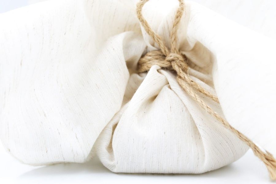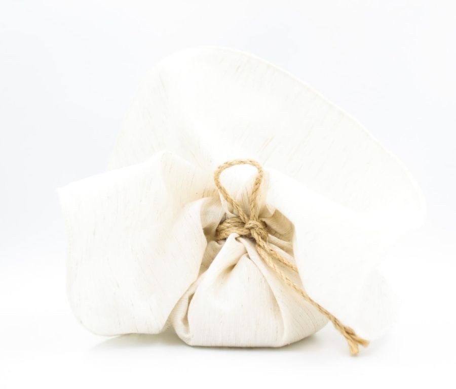 Μπομπονιέρα με ύφασμα εκρού και δέσιμο με σπάγγο.