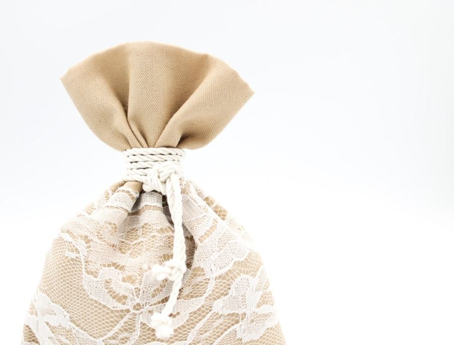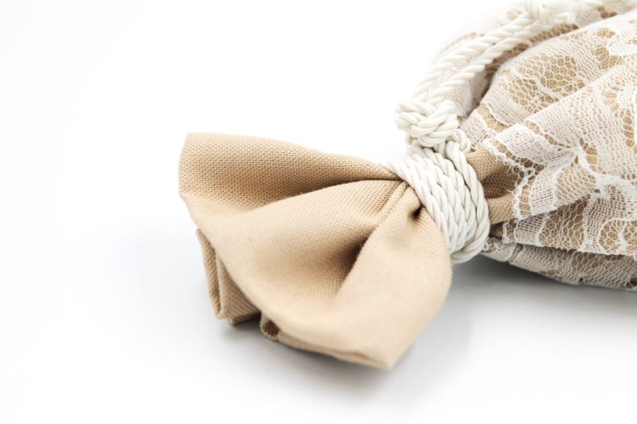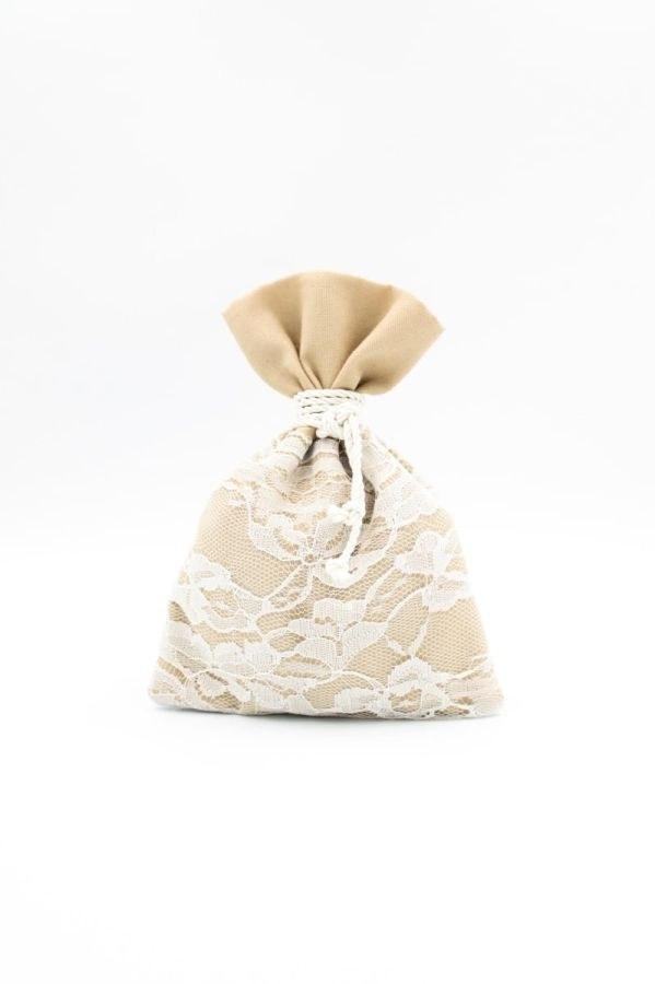 Μπομπονιέρα γάμου με πουγκί μπεζ βαμβακερό, δαντέλα λευκή και δέσιμο λαιμός με τρίκλωνο λευκό.