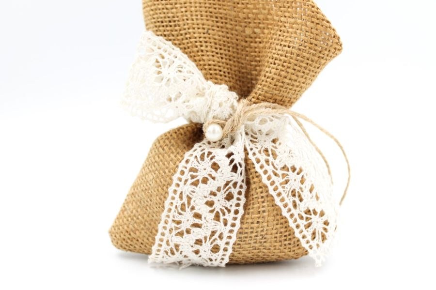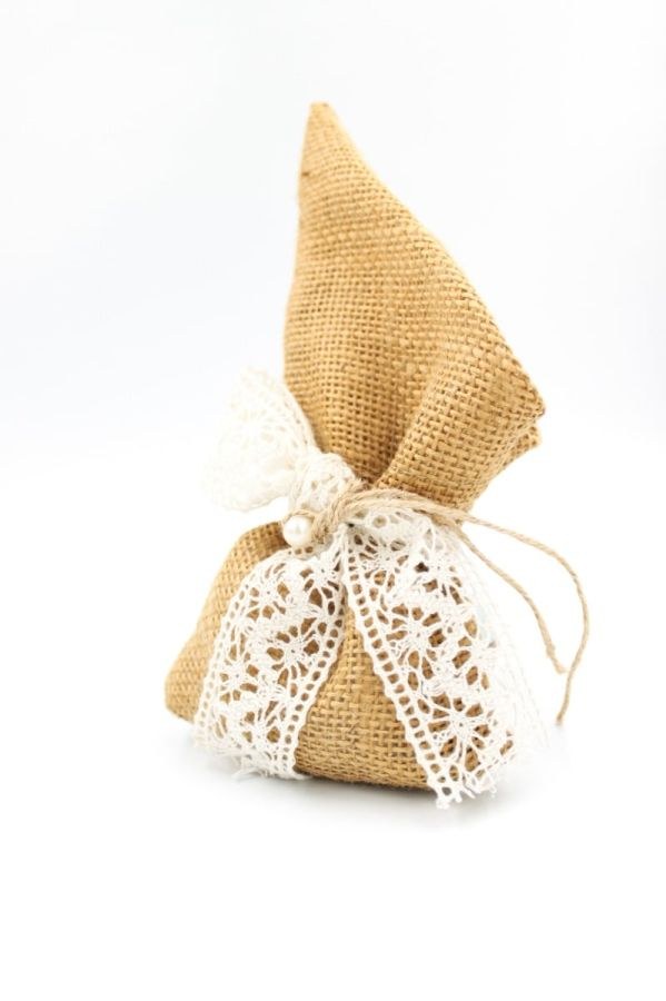 Μπομπονιέρα γάμου πουγκί λινάτσας με ασύμμετρο τελείωμα, κορδέλα δαντέλα, σπάγγο και πέρλα.
