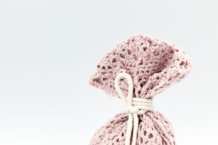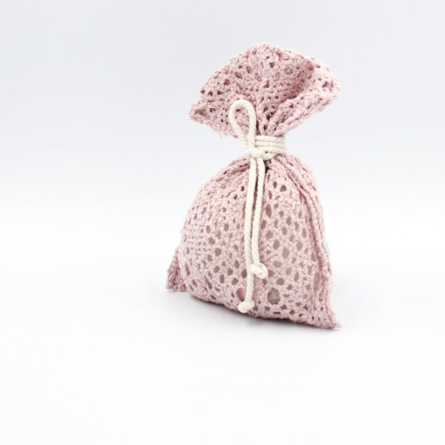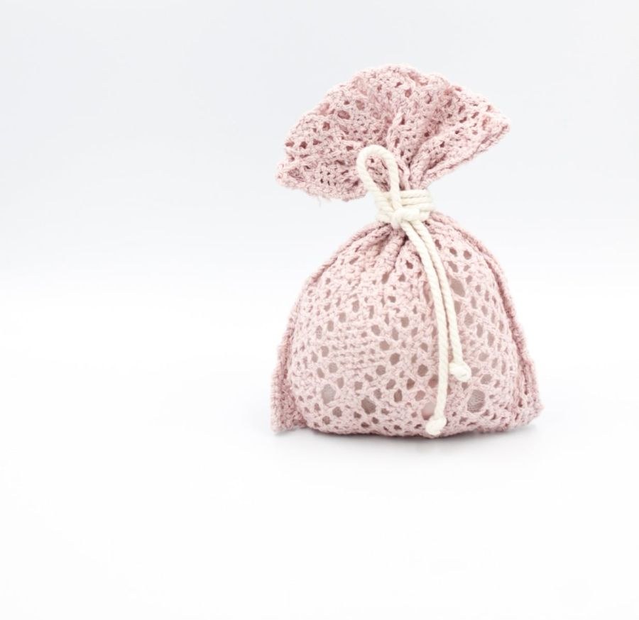 Μπομπονιέρα γάμου πουγκί πλεκτό ροζ με τρίκλωνο βαμβακερό εκρού.