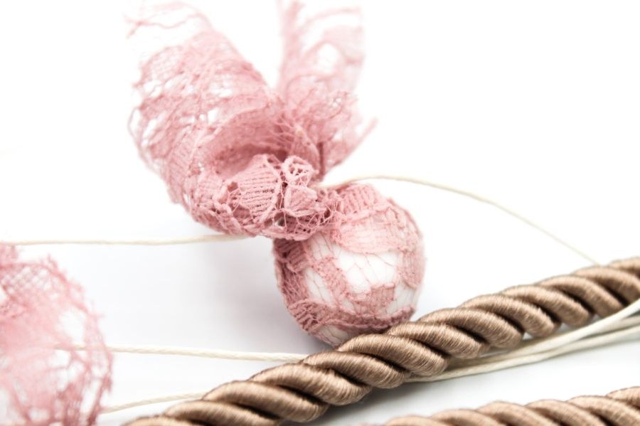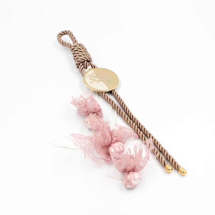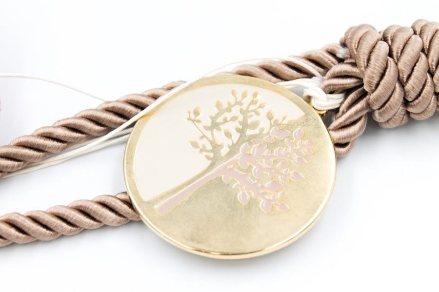 Μπομπονιέρα γάμου κρεμαστή με διακοσμητικό χρυσό με το δέντρο της ζωής, τρίκλωνο κορδόνι στο χρώμα της μόκας με χρυσά τελειώματα και πουγκάκια δαντέλας σε σάπιο μήλο για τα κουφέτα.