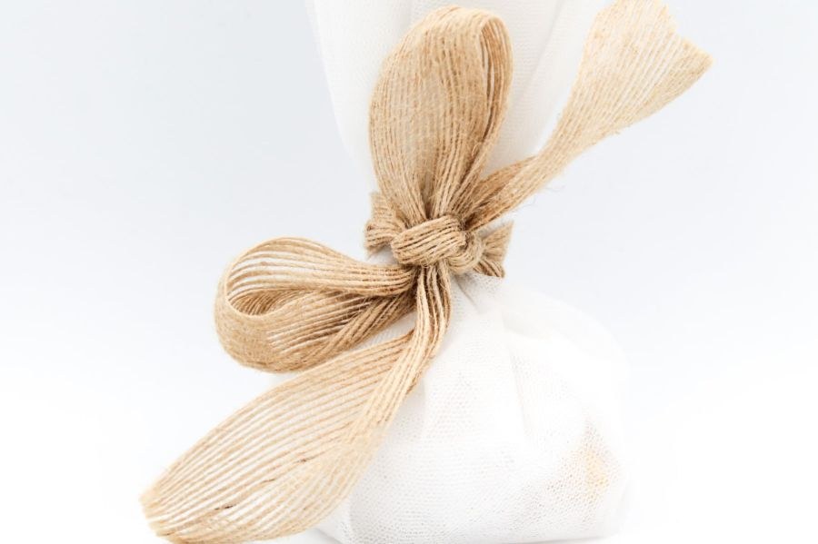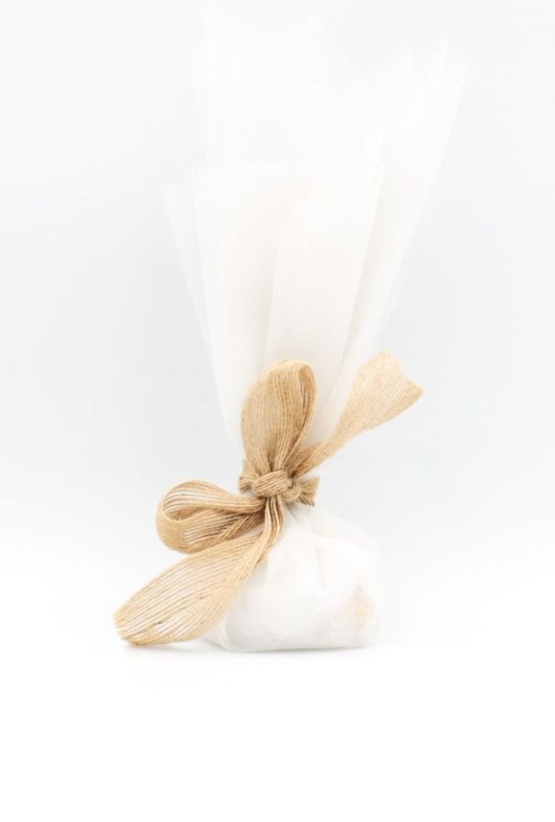 Μπομπονιέρα γάμου με 3 τούλια εκρού και δέσιμο φιόγκο από λινάτσα.