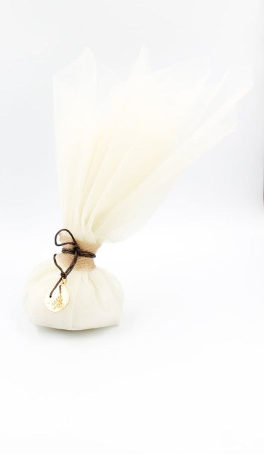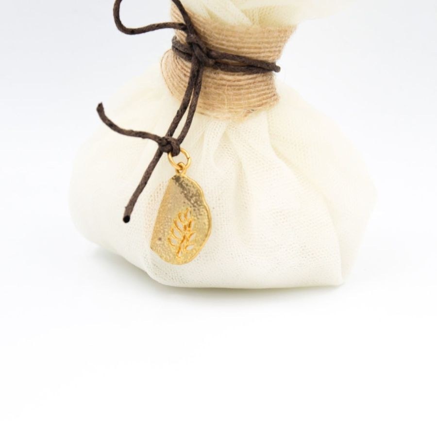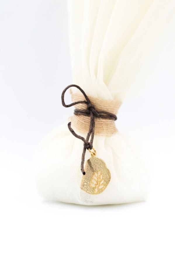 Μπομπονιέρα με 3 τούλια εκρού και δέσιμο λαιμό από λινάτσα, κέρινο κορδόνι καφέ και διακοσμητικό χρυσό δέντρο ζωής.