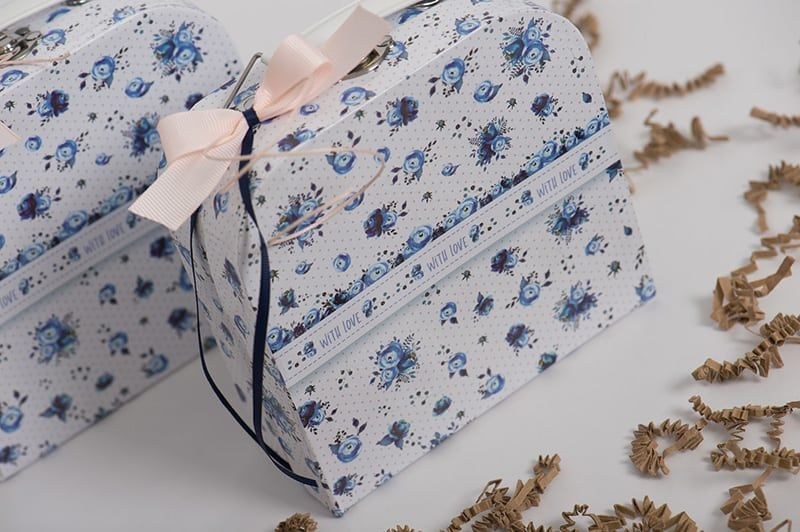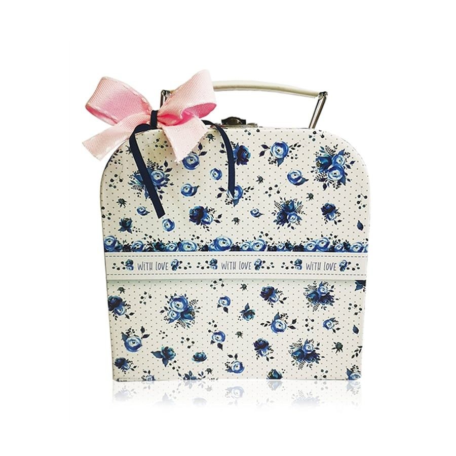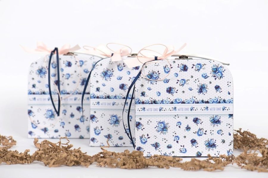 Μπομπονιέρα βαλιτσάκι μπλε λουλούδια with love. Διάσταση 15 x 15 x 6 εκ.