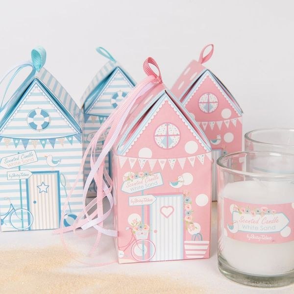 Αρωματικό κερί με μυρωδιά με θέμα παραλία σε ροζ συσκευασία, διάσταση κουτιού 12 x 6,4 εκ., διάμετρος κεριού 6,5 x 7,5 cm ύψος.