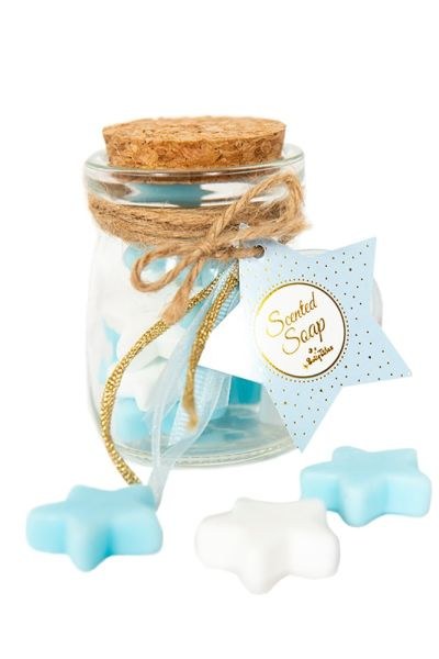 Μπομπονιέρα βαζάκι με αστεράκια σαπουνάκια άσπρα & σιελ. Διάσταση 7 x 5,5 εκ.  60 gr.