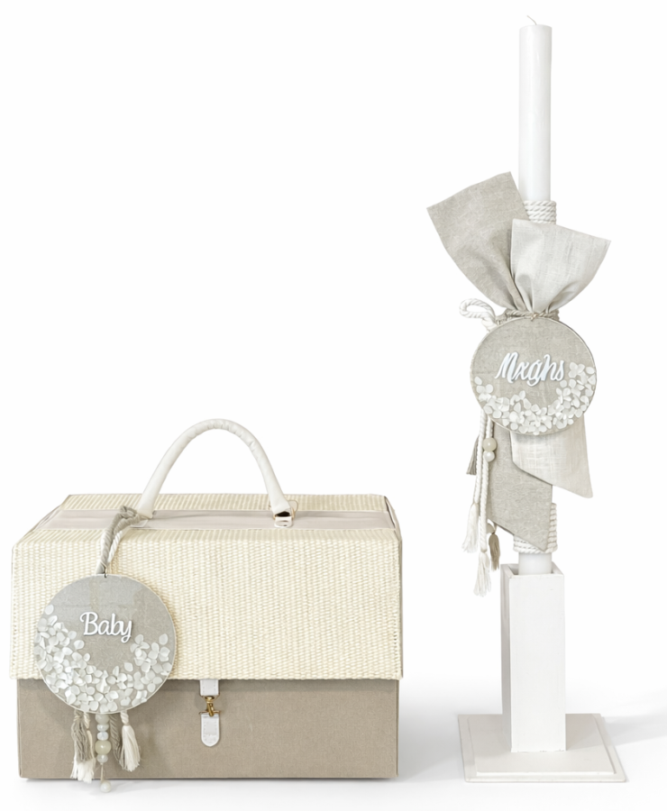 Πολυτελή βαπτιστικά πακέτα με minimal αισθητική και λεπτομέρεια πλέξιγκλας και περιλαμβάνει λαμπάδα, τσάντα και λαδοσέτ.