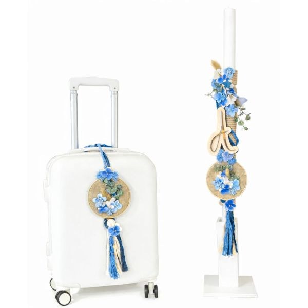 Πολυτελή βαπτιστικά πακέτα σιέλ κορδόνια και floral τελάρο και περιλαμβάνει βαλίτσα, λαμπάδα, και λαδοσέτ.