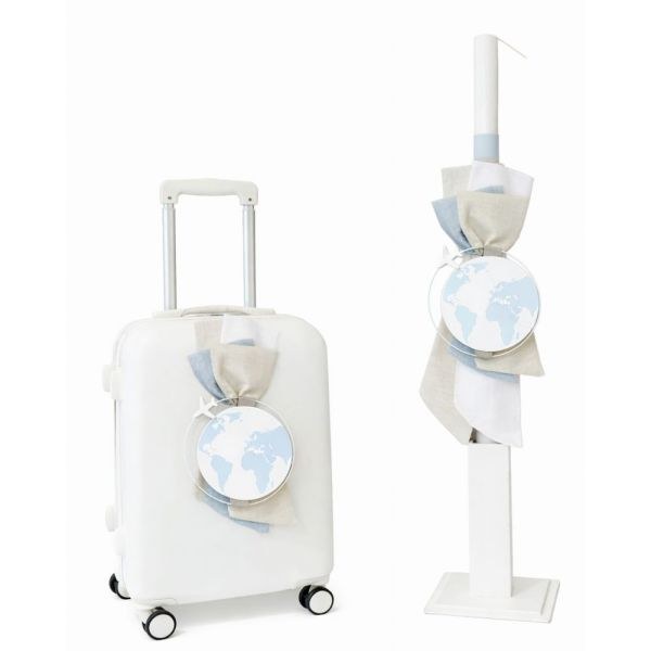 Πολυτελή βαπτιστικά πακέτα με θέμα το ταξίδι και περιλαμβάνει βαλίτσα, λαμπάδα, και λαδοσέτ.