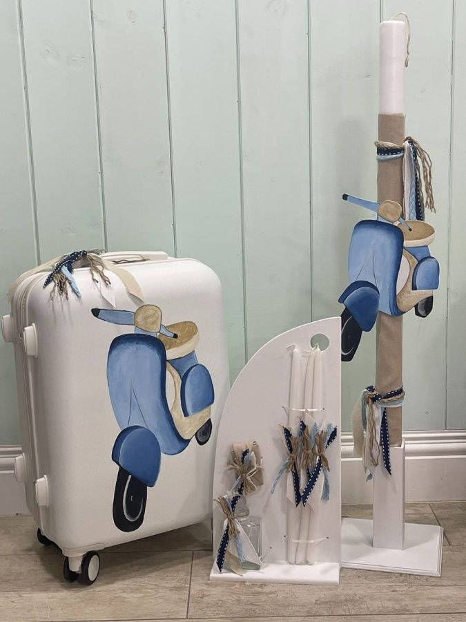 Σετ βάπτισης για αγόρι και περιλαμβάνει βαλίτσα ζωγραφισμένη, λαμπάδα και λαδοσετ.