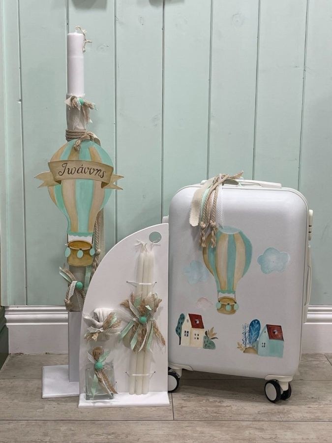 Σετ βάπτισης για αγόρι και περιλαμβάνει βαλίτσα ζωγραφισμένη, λαμπάδα και λαδοσετ.