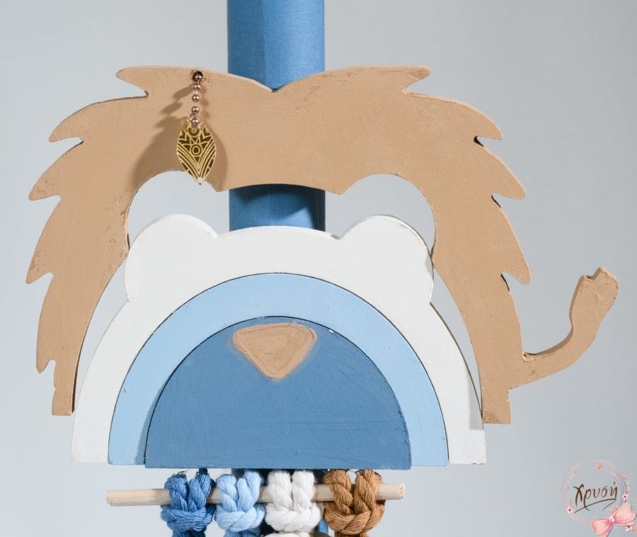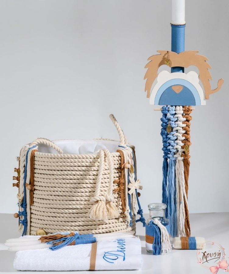 Σετ βάπτισης για αγόρι το οποίο περιλαμβάνει καλάθι ψάθινο με λιοντάρι, λαμπάδα και λαδοσέτ. Συνδυάστε το με στολισμό βάπτισης σε μπλε αποχρώσεις και με θέμα το λιοντάρι!