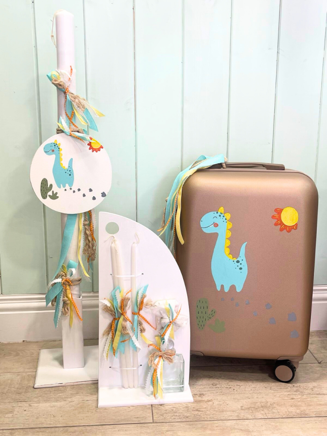 Σετ βάπτισης για αγόρι το οποίο περιλαμβάνει βαλίτσα ζωγραφισμένη, λαμπάδα και λαδοσέτ. Συνδυάζεται ιδανικά με στολισμό βάπτισης με θέμα δεινόσαυρος!