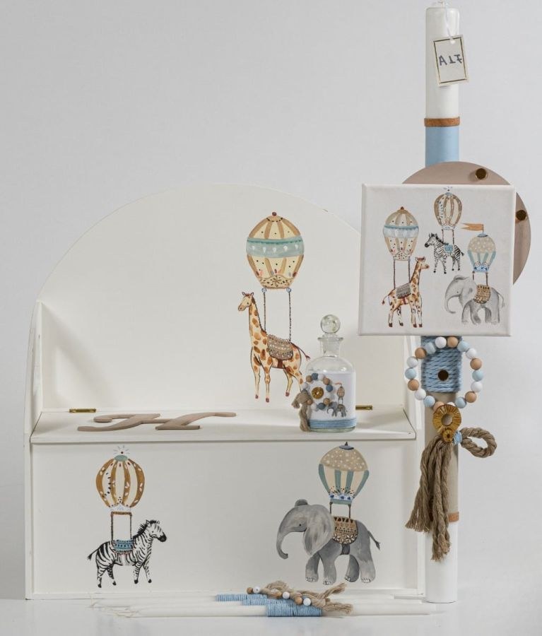 Σετ βάπτισης για αγόρι και περιλαμβάνει παγκάκι, λαμπάδα και λαδοσέτ.