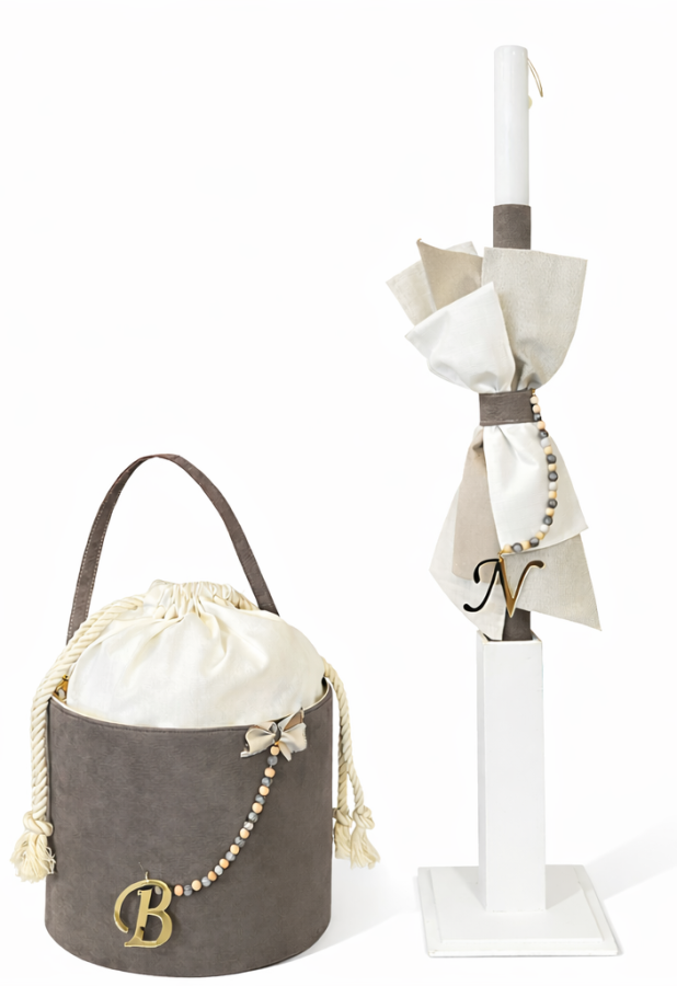 Bαπτιστικά πακέτα με χρυσό μονόγραμμα plexiglass και χάντρες και περιλαμβάνουν καλάθι, λαμπάδα, λαδοσέτ.