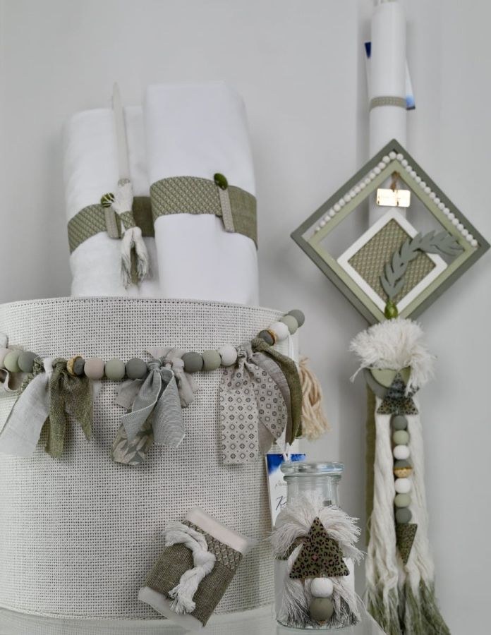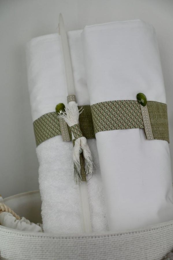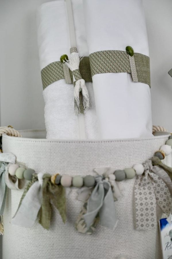 Βαπτιστικά πακέτα για αγόρι από την Stova Bambini που περιλαμβάνουν καλάθι ψάθινο, φιόγκο, λαμπάδα, λαδοσέτ και λαδόπανα.