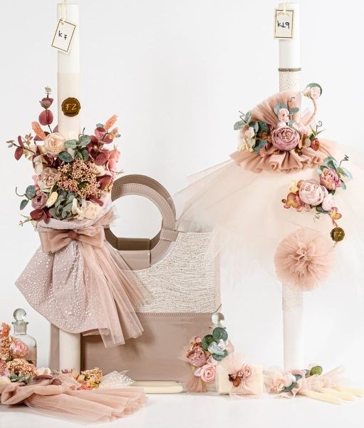Σετ βάπτισης για κορίτσι το οποίο περιλαμβάνει λαμπάδα, τσάντα και λαδοσέτ.