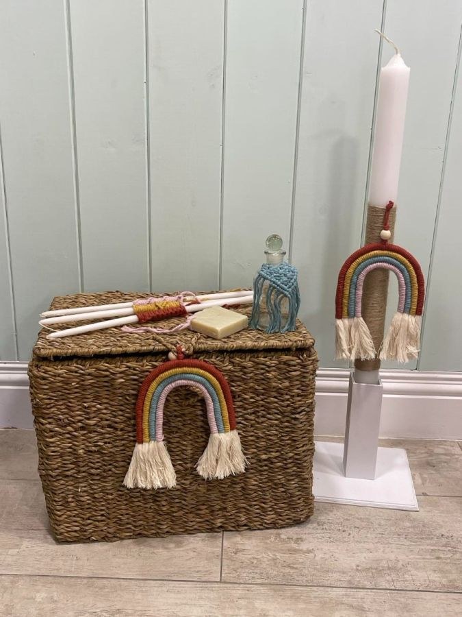 Χειροποίητο σετ βάπτισης, και περιλαμβάνει καλάθι ψάθινο, λαμπάδα και λαδοσέτ.
