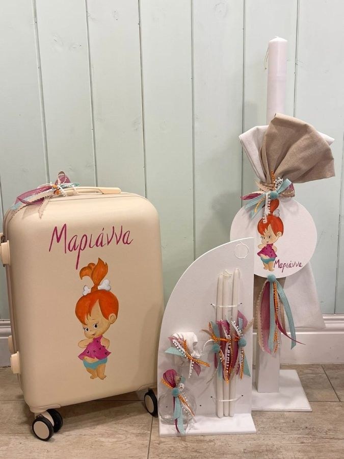 Σετ βάπτισης για κορίτσι το οποίο περιλαμβάνει βαλίτσα ζωγραφισμένη, λαμπάδα και λαδοσέτ!