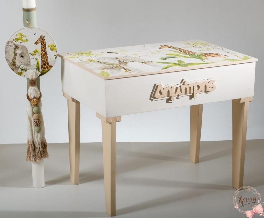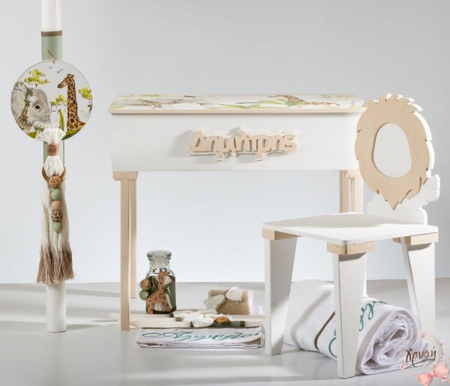 Βαπτιστικά πακέτα που περιλαμβάνουν γραφείο ζωγραφισμένο, καρέκλα, λαμπάδα και λαδοσετ.