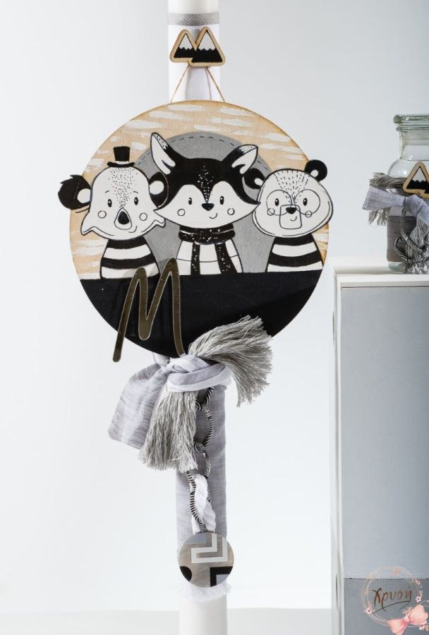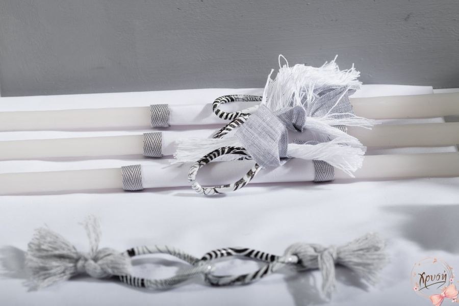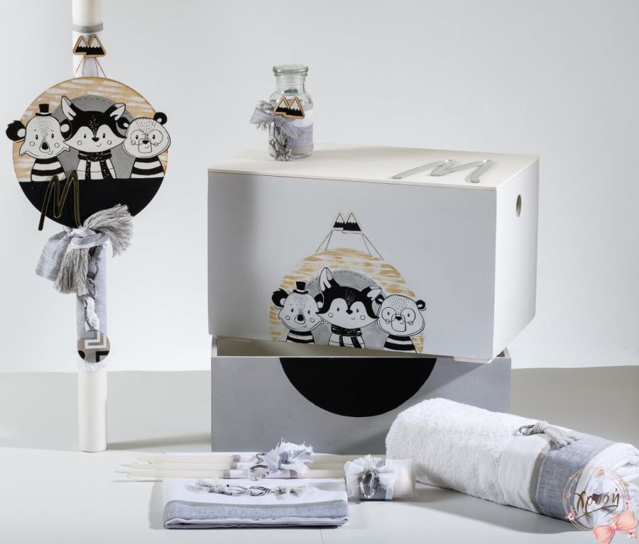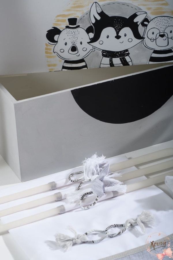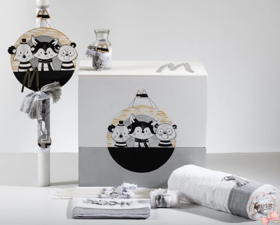 Βαπτιστικά πακέτα που περιλαμβάνουν διπλό κουτί ζωγραφισμένο που ανοιγοκλείνει, λαμπάδα και λαδοσέτ.