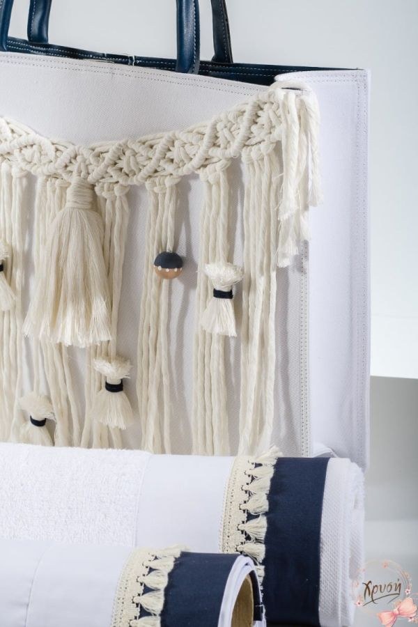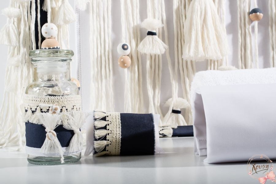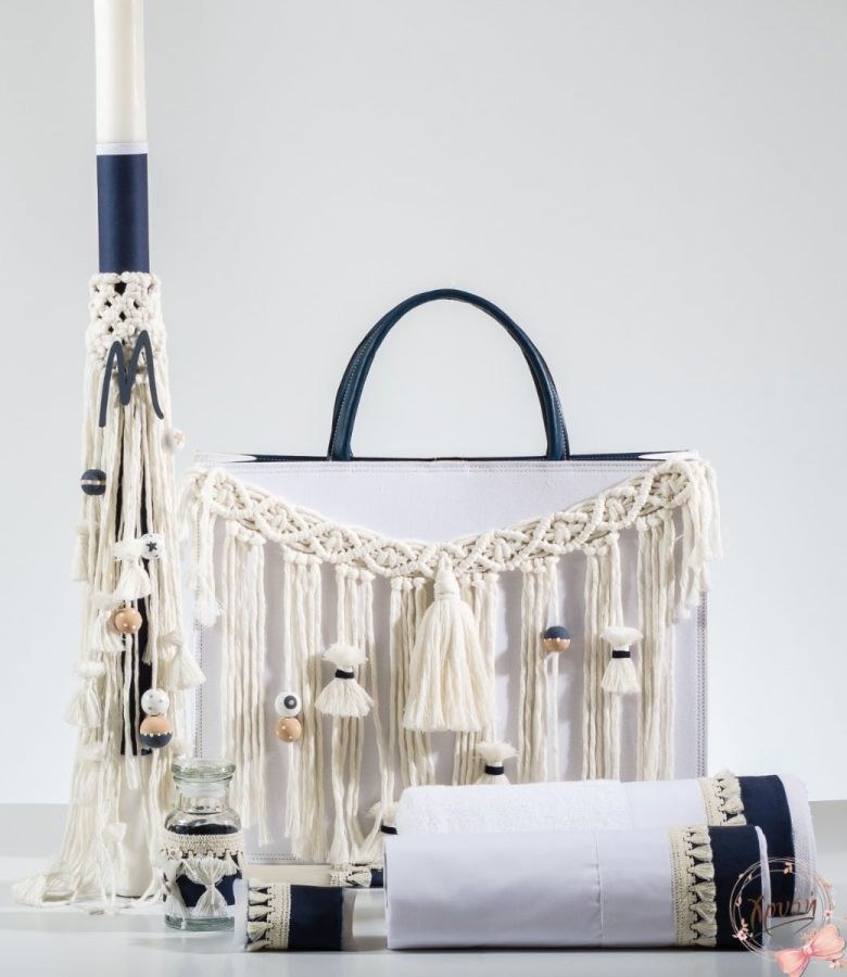 Βαπτιστικά πακέτα που περιλαμβάνουν τσάντα δερματίνη με μακραμέ και boho διακόσμηση, λαμπάδα και λαδοσέτ.