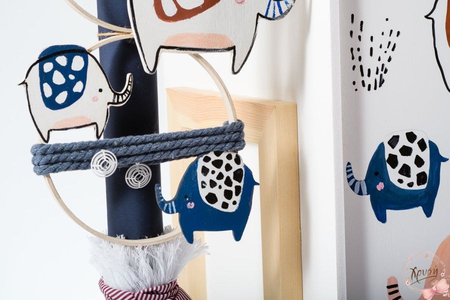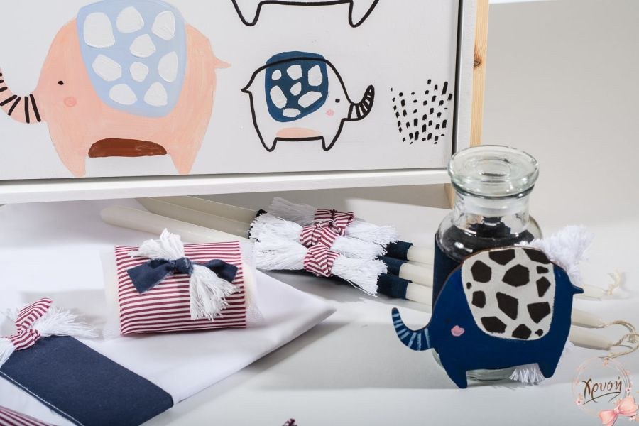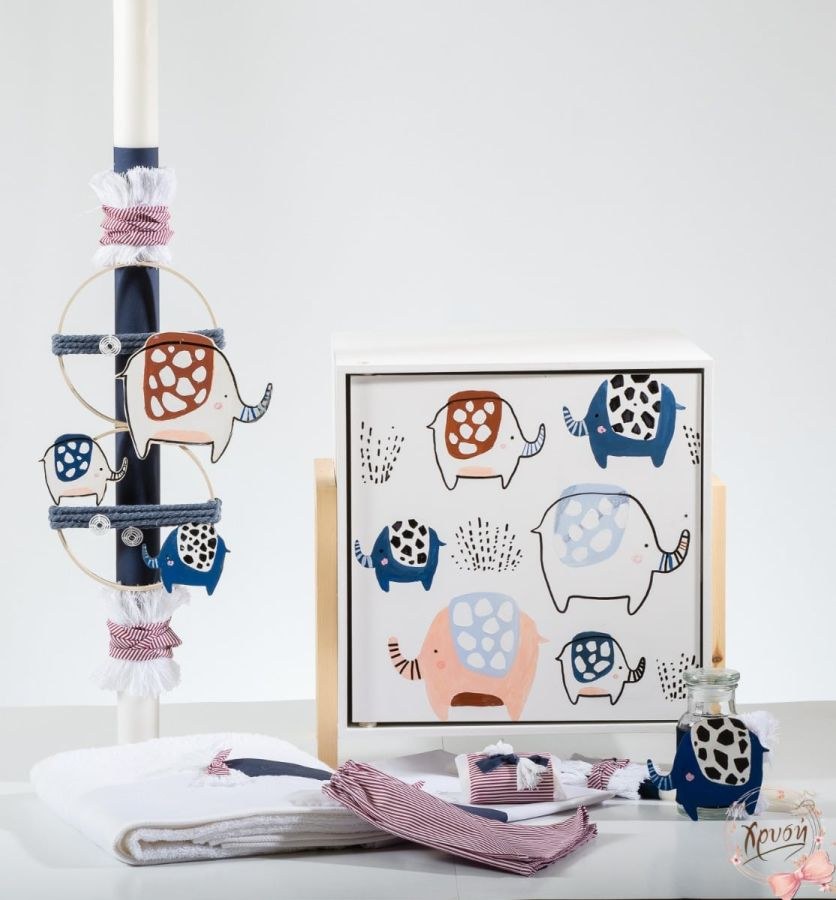 Βαπτιστικά πακέτα που περιλαμβάνουν ξύλινο κουτί με καπάκι ανοιγόμενο μπροστά, λαμπάδα και λαδοσέτ.