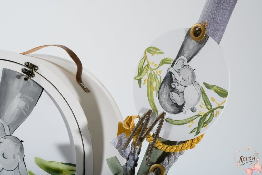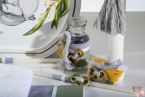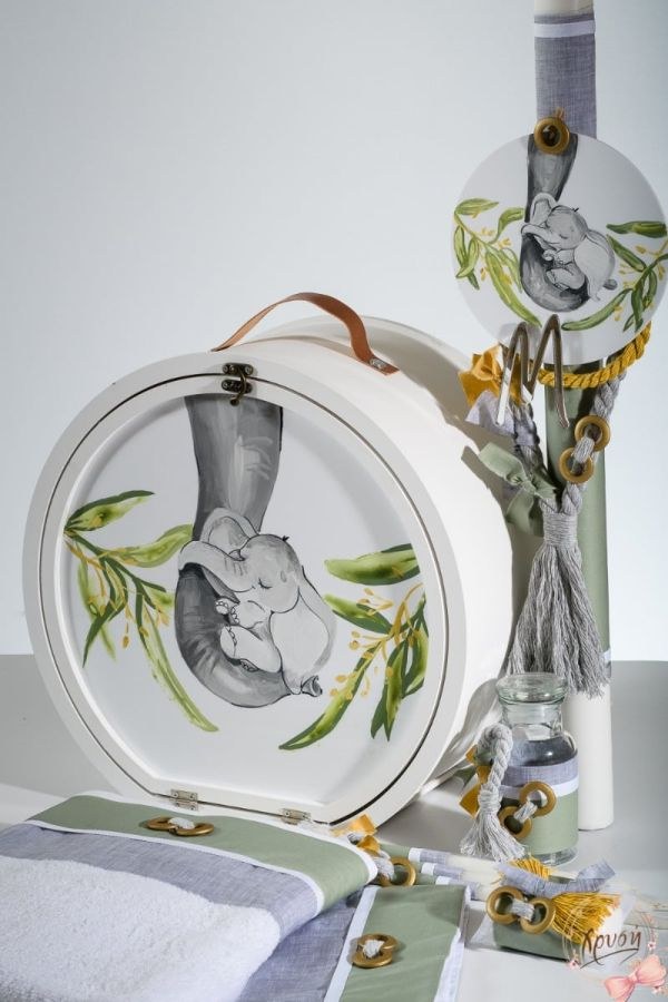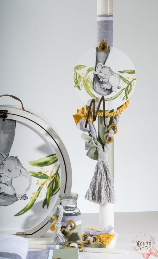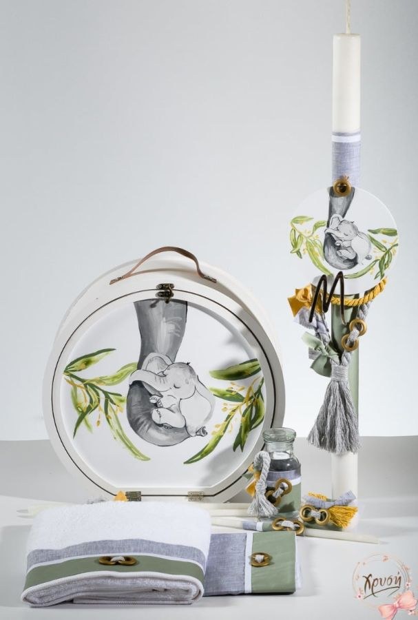 Βαπτιστικά πακέτα που περιλαμβάνουν ξύλινη καπελιέρα ζωγραφισμένη με καπάκι plexiglass, λαμπάδα και λαδοσέτ.