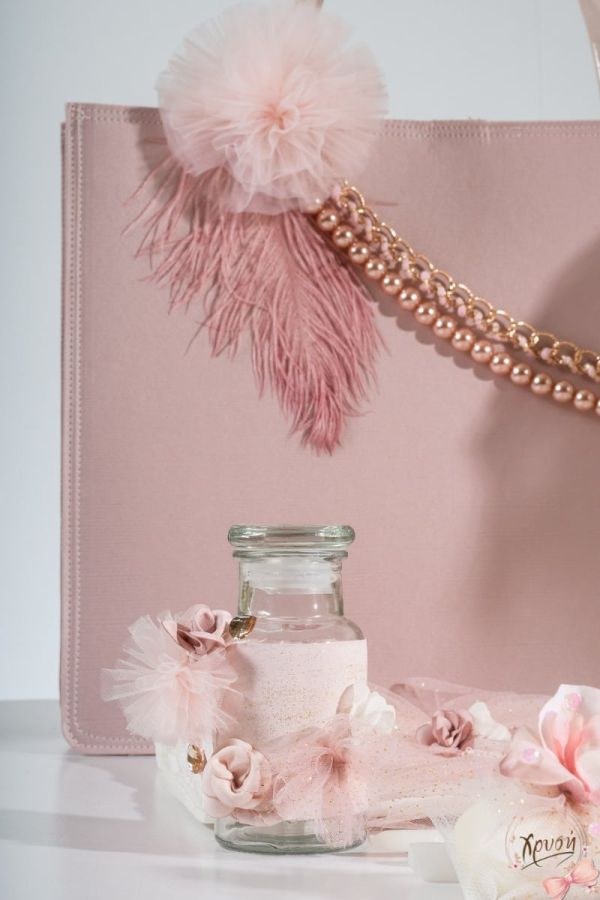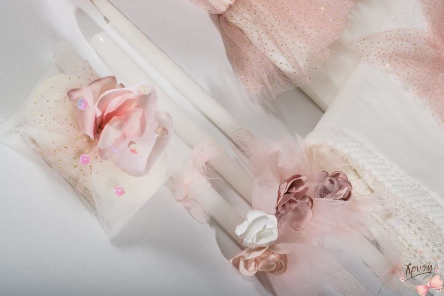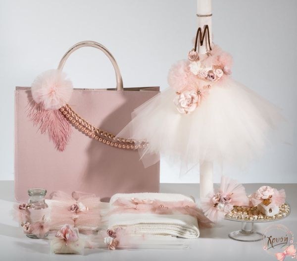 Βαπτιστικά πακέτα που περιλαμβάνουν τσάντα, λαμπάδα με ύφασμα μεταξωτό και λαδοσέτ.