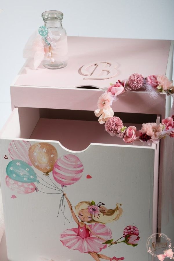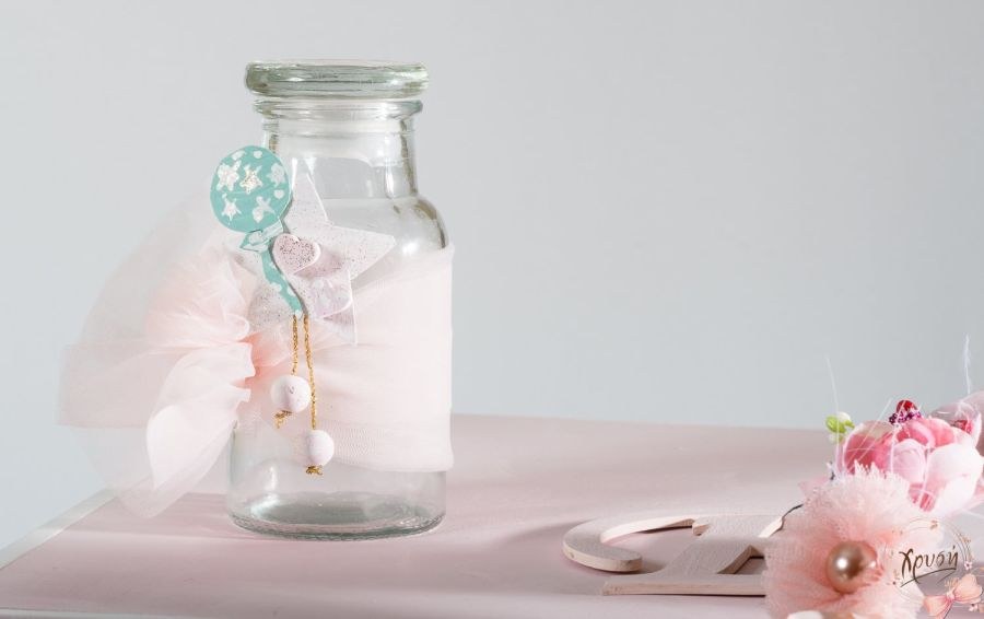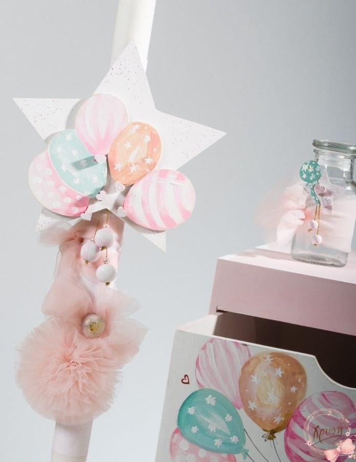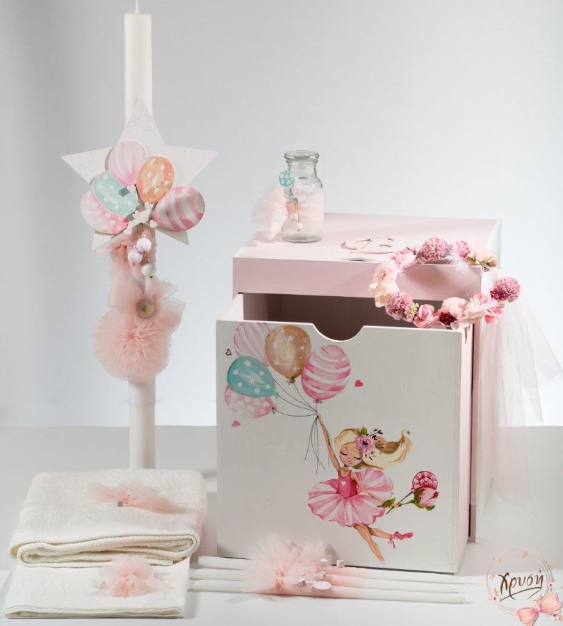 Βαπτιστικά πακέτα που περιλαμβάνουν κουτί-κύβος-γραφείο, λαμπάδα με κοριτσάκι και μπαλόνια και λαδοσέτ.