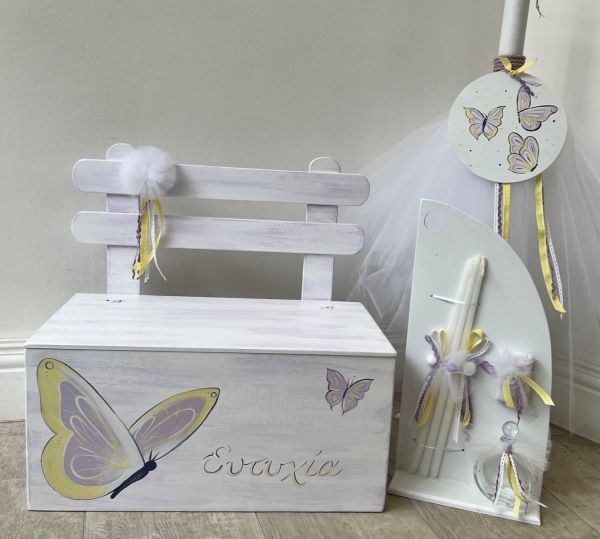 Βαπτιστικά πακέτα που περιλαμβάνουν παγκάκι, λαμπάδα και λαδοσέτ.