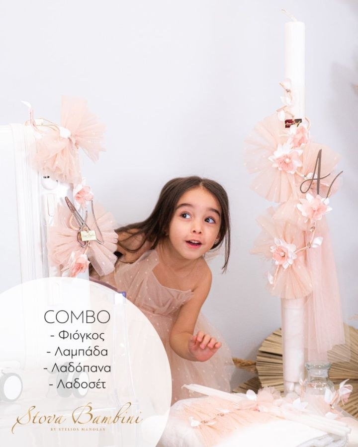 Συνδυάζεται με τα υφάσματα και τις λεπτομέρειες του ρούχου της Stova Bambini που θα επιλέξετε. Μπορεί να προστεθεί θεματικό αξεσουάρ (χωρίς έξτρα χρέωση). Το Combo Set περιέχει λαμπάδα βάπτισης, φιόγκο για τη βαλίτσα ή το ψάθινο καλάθι σας, λαδόπανα, εσώρουχα, πετσέτες και λαδοσέτ (κεράκια-σαπούνι-μπουκάλι λαδιού). Δεν περιέχει κουτί/τσάντα/βαλίτσα.