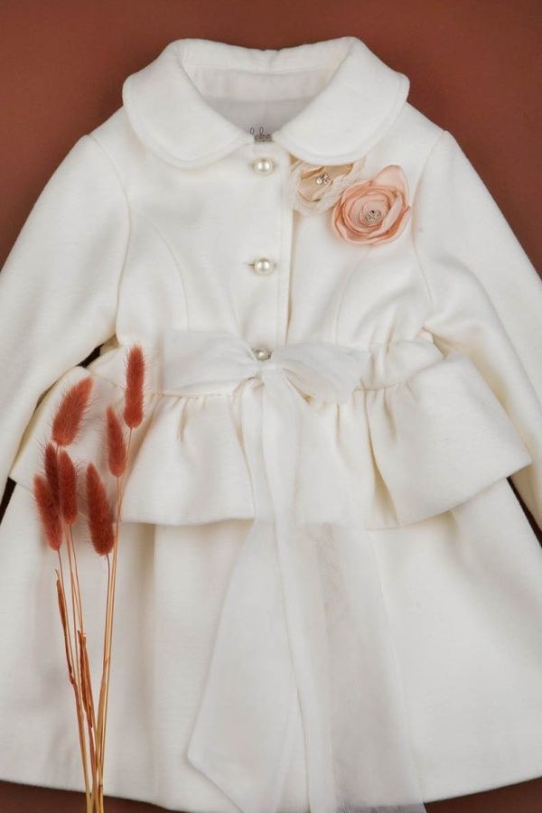 Κλασικό παλτουδάκι σε ιβουάρ από απαλό «wool touch» ύφασμα, ιδανικό για χειμερινές βαπτίσεις. Κομψός γιακάς, περλέ κουμπιά μπροστά και εντυπωσιακό φιόγκο στη μέση με peplum βολάν που χαρίζει κοριτσίστικη φινέτσα. Πλήρως φοδραρισμένο για ζεστασιά και άνεση.