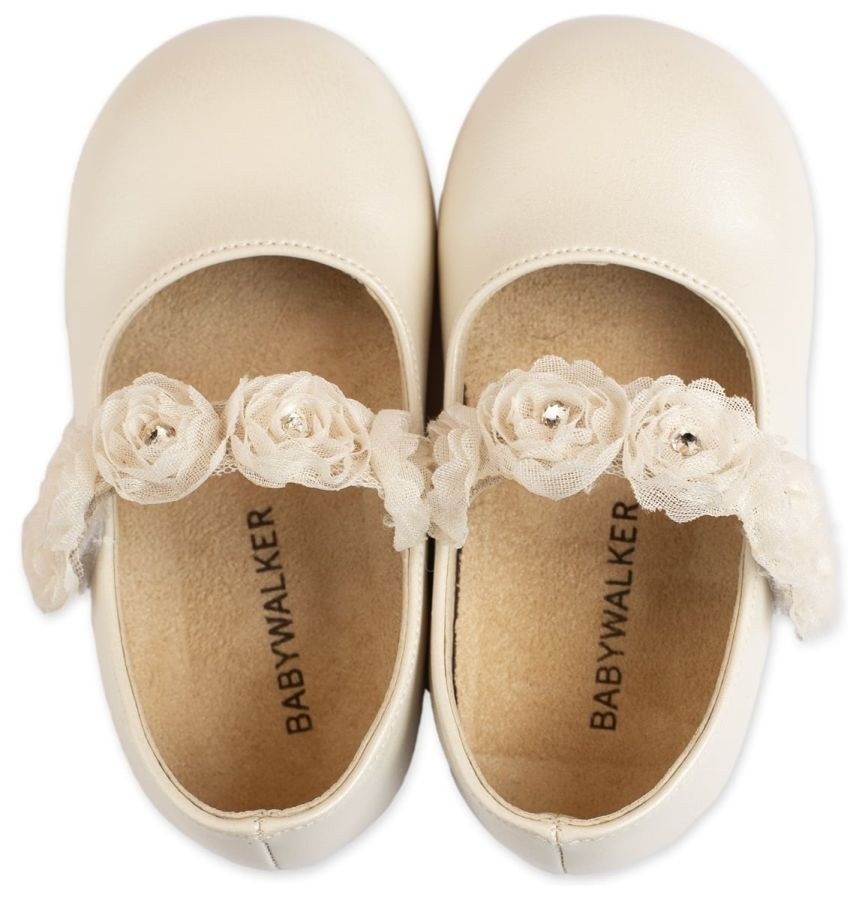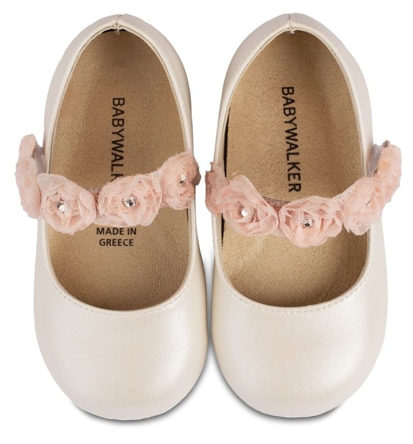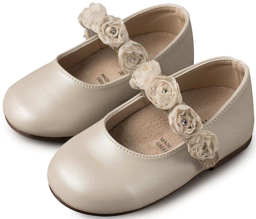 Δερμάτινο Γοβάκι Μονή Μπαρέτα με Chiffon Λουλούδια από Συνθετικό Δέρμα σε Εκρού Ροζ, εκρού και λευκό χρώμα.