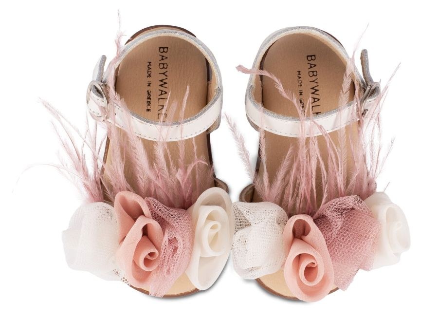 Δερμάτινο Πέδιλο Διακοσμημένο με Λουλούδια και Φτερά σε Εκρού Ροζ Χρώμα.
