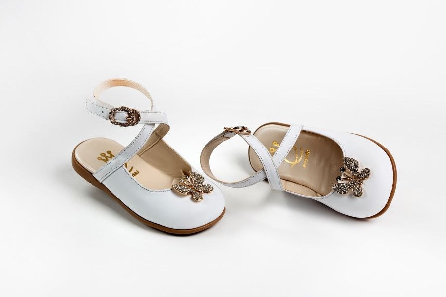 Μπαλαρίνα περπατήματος mule από λευκό δέρμα διακοσμημένη με μεταλλική στρας πεταλούδα.