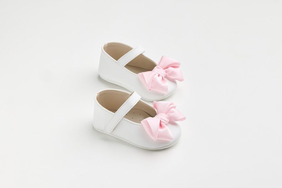 Μπαλαρίνα αγκαλιάς σε λευκό τεχνόδερμα με χειροποίητο ροζ γκρο φιόγκο.
