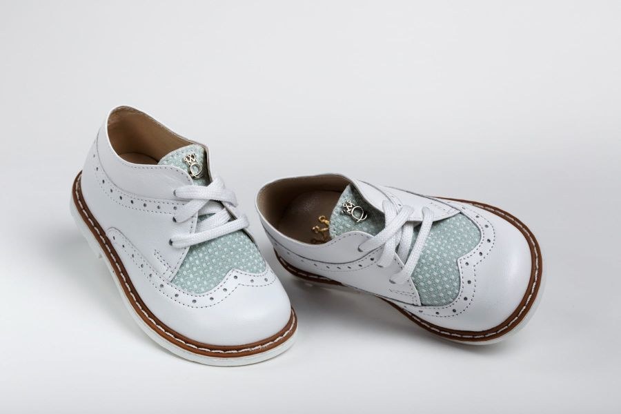 Παπούτσι περπατήματος χαμηλό brogues δετό, από λευκό δέρμα και μέντα-λευκό ύφασμα με μοτίβο