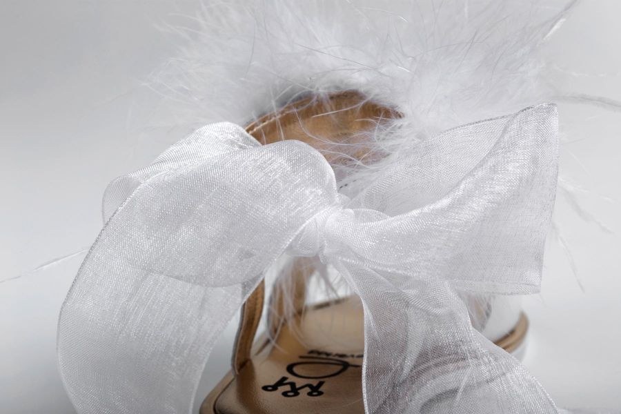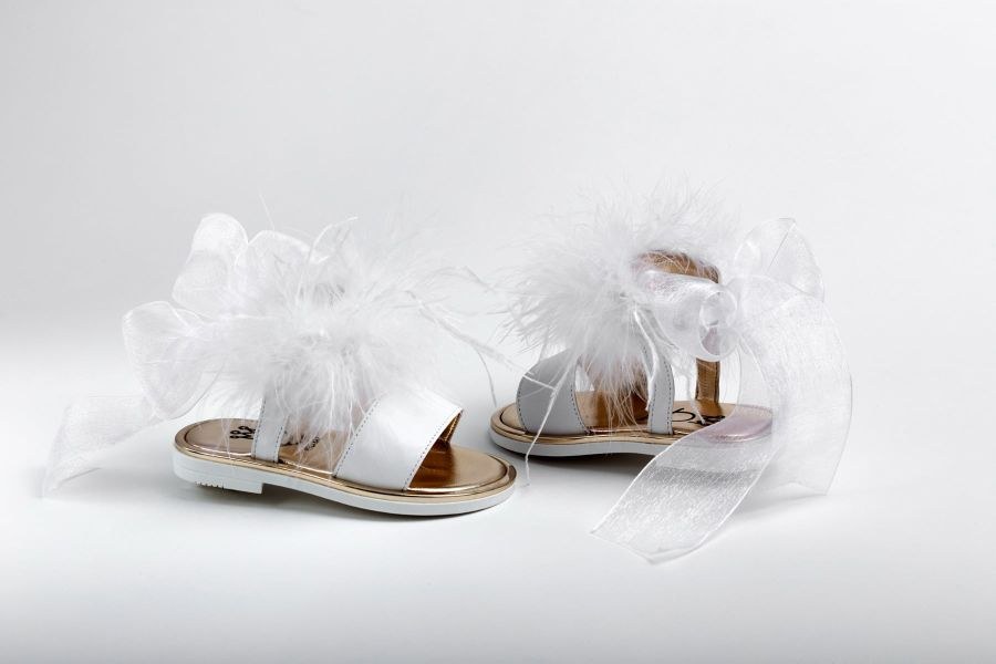 Σανδάλι περπατήματος από λευκό δέρμα διακοσμημένο με φτερά και πούπουλα, κλείσιμο με λευκή οργαντίνα κορδέλα