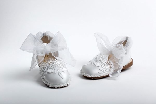 Εσπαντρίγια περπατήματος από εκρού δέρμα και σατέν, διακοσμημένη με δαντέλα και τρέσα από πέρλες, δέσιμο με τούλι.