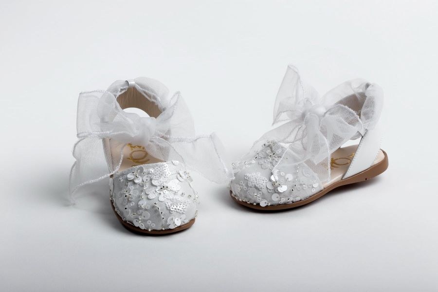 Εσπαντρίγια περπατήματος από εκρού δέρμα και σατέν, διακοσμημένη με 3D λουλούδια, δέσιμο με offwhite τούλι.
