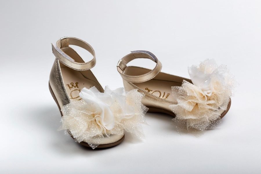 Μπαλαρίνα περπατήματος από χρυσό δέρμα, διακοσμημένη με τούλι γκλίτερ και μουσελίνα, κλείσιμο με Velcro στον αστράγαλο.