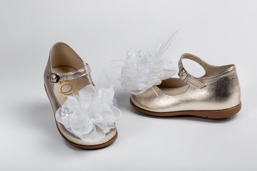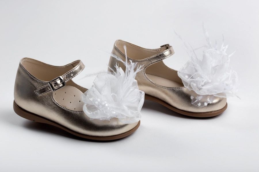 Μπαλαρίνα περπατήματος από χρυσό δέρμα, διακοσμημένη με λευκή παιώνια από μουσελίνα, τούλι πουά και φτερά, κλείσιμο με αγκράφα.
