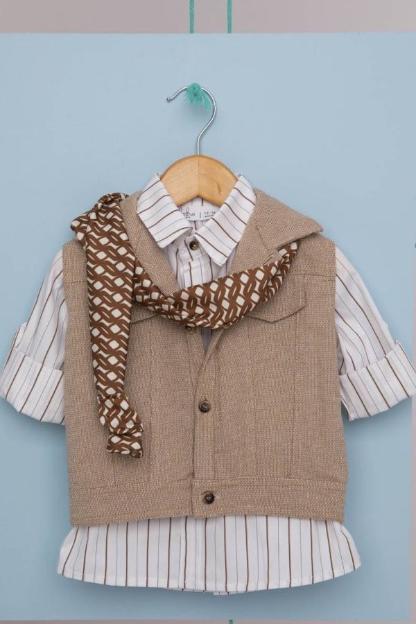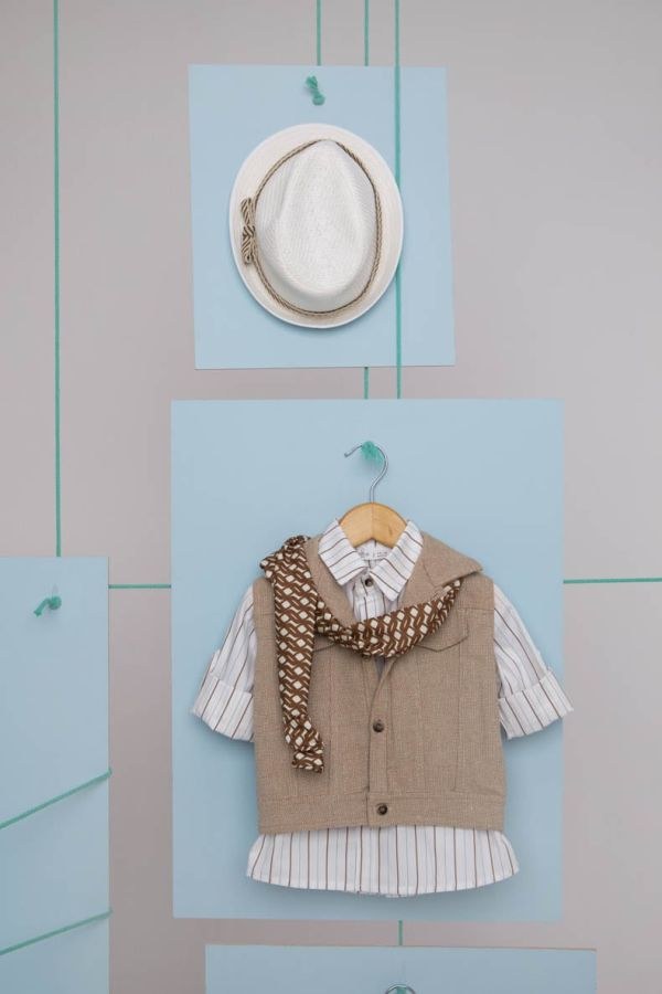 Ο Valerios είναι ο απόλυτος συνδυασμός στις αποχρώσεις του μπεζ με καφέ. Μπουφάν αμάνικο για ξεχωριστή εμφάνιση από 100% rammie μπεζ ύφασμα. Πουκάμισο λευκό με καφέ ρίγες 100% cotton. Παντελόνι στο χρώμα της άμμου από 100% λινό Ιταλίας με ταμπα δερμάτινη ζώνη και αξεσουάρ. Φουλάρι σατέν με printed καφέ σχέδιο. Καπέλο λευκό καβουράκι με τρεσσα από ιδιαίτερο κορδόνι.