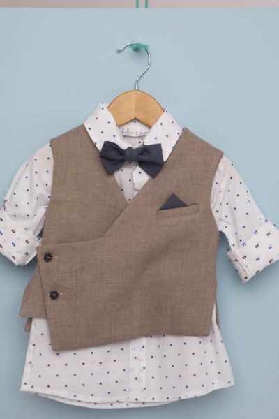 Ο Vlassis είναι ένας συνδυασμός σε σοκολά με μπλε ραφ που δίνει στη βάπτισή σας μια ιδιαίτερη νότα. Γιλέκο σοκολά σε linneta 100% Ιταλίας. Πουκάμισο με μικρά πουά σε σοκολά και μπλε ραφ. Παντελόνι σε μπλε ραφ diagonal καπαρντίνα με μπεζ κορδόνι για ζώνη. Καπέλο λευκό ψάθινο με μπλε ραφ κορδέλα.